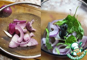 Лук нарезать, ошпарить кипятком, чтобы ушла горечь. Измельчить в блендере вместе с листьями базилика.