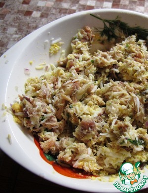 Слить сок из консервов, измельчить яйцо. Рыбу растолочь вилкой и смешать с мелко рубленным яйцом и луком.