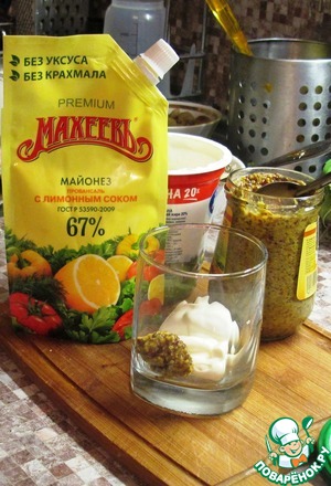 Майонез смешать со сметаной и горчицей. Заправить рыбную смесь этим соусом.