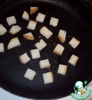 Пока измельчается суп, займемся гренками. Делать их можете как хотите: подсушивать в духовке, обжаривать на сливочном масле, растительном, оливковом, в тосте или, как я, на сухой сковороде.