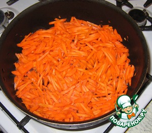 Собираем торт: печеночный "корж" + лук + морковка + майонез (и так 3 раза).