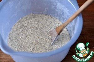 В миску насыпаем просеянную пшеничную, кукурузную, миндальную муку и разрыхлитель. -