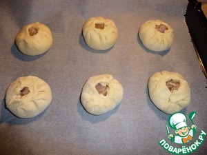 Защипнуть края, оставляя небольшое отверстие. Выложить на противень, застеленный пекарской бумагой. Накрыть пленкой или миской и убрать в теплое место на 2,5 часа.