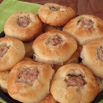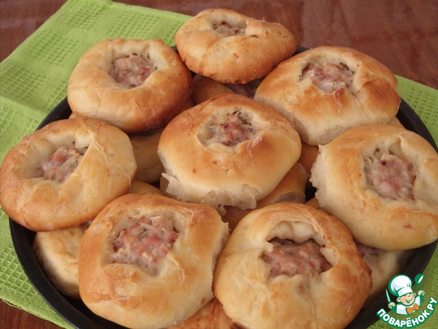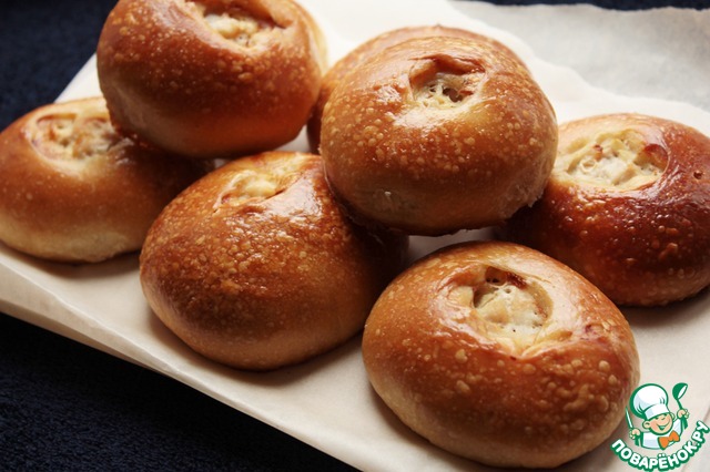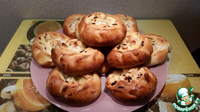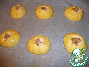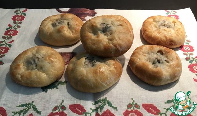 За 5 мин перед выпечкой смазать пироги желтком. Печь в разогретой духовки до 200С 20 - 25 мин. После выпечки накрыть пироги пекарской бумагой и полотенцем на 10 мин.