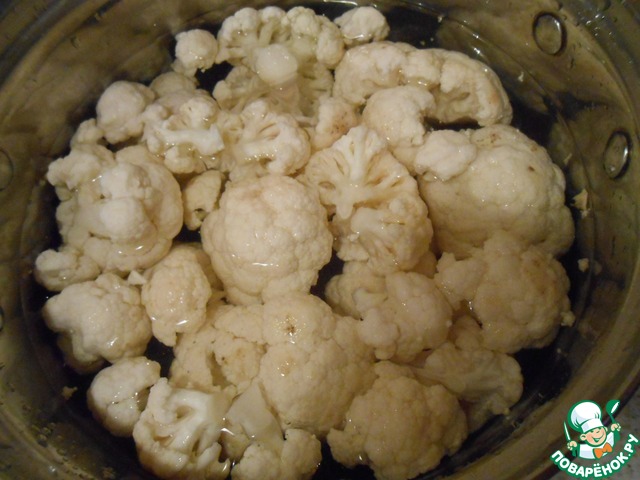 • 10 шт. маслин измельчить в миксере или блендером, если нет, мелко, мелко порезать. Теперь самое интересное, укладываем соцветие цветной капусты (использовать только верхнюю часть соцветий с коротким стебельком), мордочку покрываем мелко измельченными маслинами.