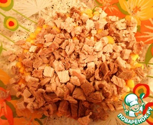 • В глубокую миску выложить кукурузу, вареное мясо, порезанное квадратиками