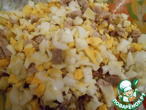 • Яйца порезать квадратиками и добавить в миску, оставить немного белка и желтка для украшения