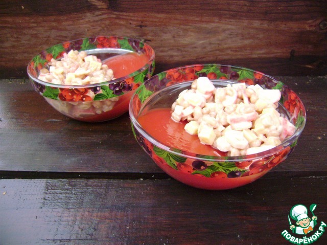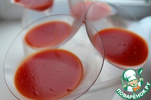 Сделать томатное желе. Для этого нагреть томатный сок до 70-80 градусов (при необходимости посолить), залить им желатин. Перемешать до полного растворения желатина, процедить и разлить по бокалам/ стаканам. Бокалы установить в холодильнике таким образом, чтобы они находились под наклоном примерно 45 градусов. Некоторые используют контейнер для яиц или пенопласт, я же использовала большой пластиковый контейнер, где у меня поместилось 5 бокалов. Оставить в холодильнике до застывания (2-3 часа).