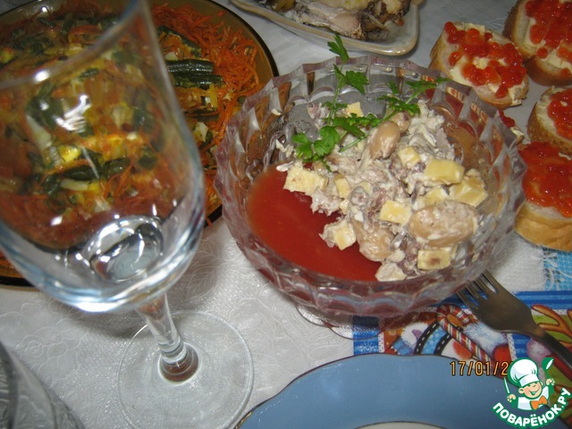 Предлагаю Вашему вниманию не хлопотную, но очень эффектную и красивую закуску! Нежное томатное желе и аппетитный сырно-фасолевый салат в сочетании друг с другом дают непревзойденный вкус.