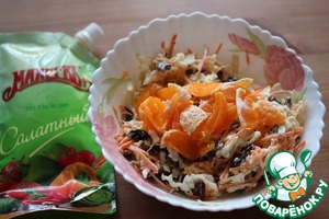 • 5. Заправить салат майонезом, хорошо перемешать. В последнюю очередь добавить мандарины.