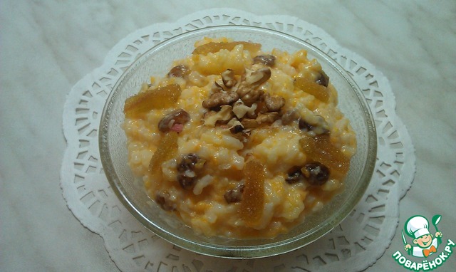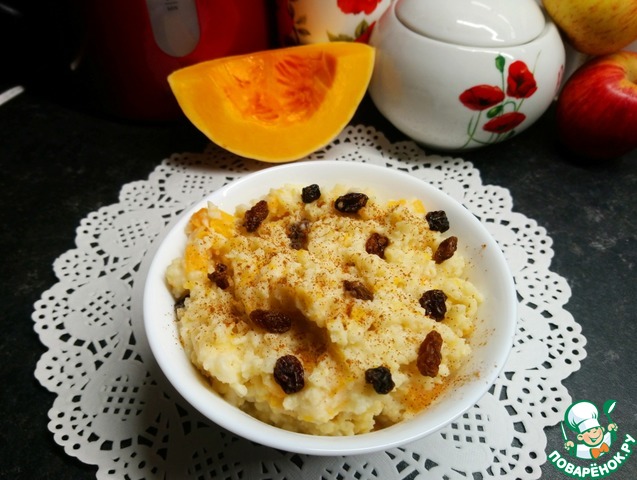 В кастрюлю влить 500 мл. воды, довести до кипения, всыпать пшено, накрыть крышкой и варить на медленном огне 20 минут. Через 10 минут с начала варки перемешать, еще через 10 минут добавить тыкву, яблоки и горячее молоко (Молоко предварительно влить в сотейник нагреть до появления пузырьков), перемешать, закрыть крышкой и варить на медленном огне 10 минут.