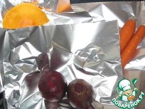 Овощи слегка смазать растительным маслом, завернуть и запечь до мягкости. Морковь и тыква запекаются примерно минут 40, свёкла 1 час.