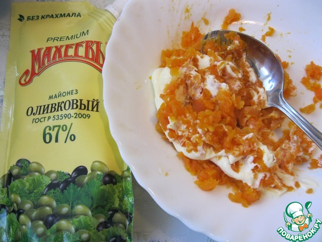Морковь и тыкву натереть на крупной тёрке, смешать с майонезом (2-3 ст. л.).