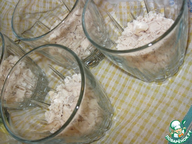 Отварное мясо курицы (у меня мясо с грудки) порезать средними кусочками. Выложить на дно бокалов, слегка утрамбовать, присолить.