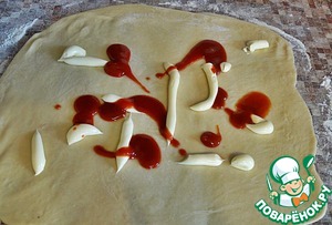 Раскатать тесто в пласт толщиной в 0.5 см, намазать его майонезом и кетчупом "Махеевъ"