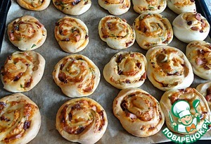 Выложить мини-пиццы на пергамент. Духовку разогреть вместе с противнем до температуры 220*С. Когда духовка нагреется, нужно бумагу с пиццами быстро перетащить на горячий противень и вернуть его в духовку на 15-20 мин.