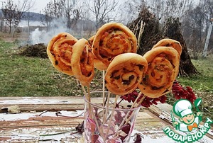 Хочу предложить вам один из рецептов итальянской пиццы. Вряд ли мне удастся вас удивить, но мне так понравился этот рецепт, что я решила поделиться им с вами. Мои мужчины. когда сжигали старые листья, немного замёрзли в этот холодный осенний денёк, поэтому были мне бесконечно благодарны, когда я им "выкатила" это замечательное блюдо с пылу-с жару, да ещё со стаканчиком горячего чайку. Для того, чтобы им не нужно было бежать и мыть руки, я каждую пиццу насадила на деревянный шампур.