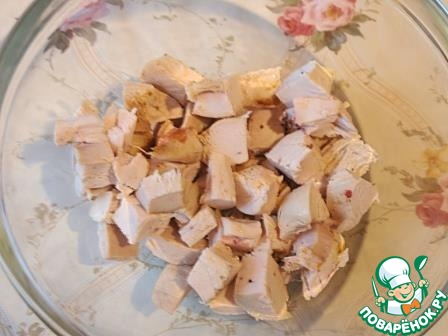 С куриной грудки снять кожу, убрать косточки, филе порезать кубиками, выложить в миску.