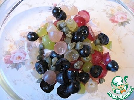 - Виноград (по 1/4 стакана зеленого, розового, черного и красного винограда + немного ягод для украшения) — 1 стак.