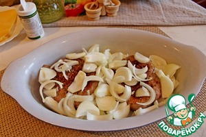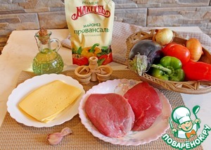 Для приготовления нам понадобится :2 медальона из телятины, весом примерно по 200 гр каждый, баклажан, лук, болгарский перец 2-х цветов, помидоры, соль, перец черный молотый, майонез Махеев, масло растительное для жарки, чеснок и сыр твердый пластинами (или можно просто натереть ).