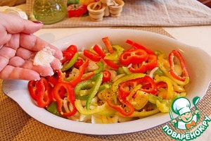 Затем полукольцами болгарский перец, посолить и поперчить.