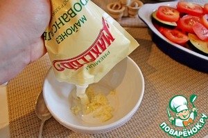 Теперь готовим соус. Для этого надо смешать чеснок через пресс, майонез и 100 мл кипяченной воды.