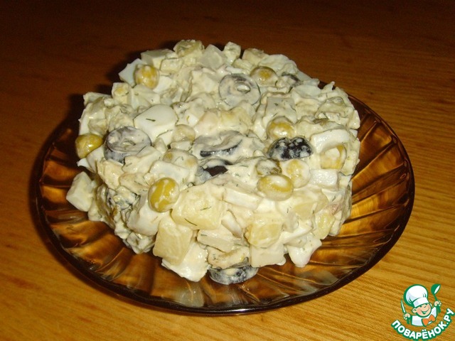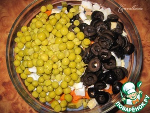 В салатник всыпать горошек и маслины, нарезанные колечками.