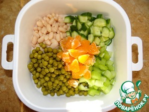 Добавить не мелко резанный огурец, сельдерей и мандарин;