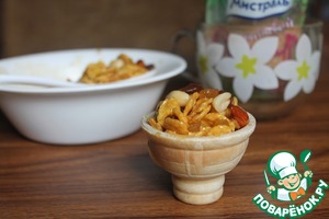 Ставим кастрюлю с водой на огонь, добавляем сахар и помешиваем до его полного растворения, когда начнет закипать, добавляем все орехи и хлопья, перемешиваем и снимаем с плиты. Сливки очень хорошо нагреваем, но не кипятим и выливаем в ореховую смесь. Туда же отправляем масло. Тщательно перемешиваем.