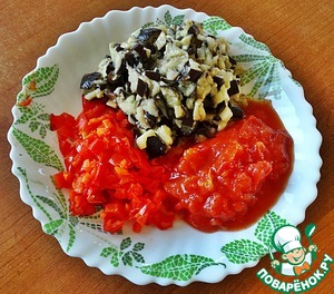 Овощи (кроме лука) запечь в духовке, снять кожицу с перца и помидор, порезать кубиком.