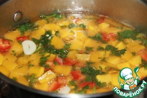 Вскипятить воду с солью, сахаром, уксусом, растительным маслом, добавить тыкву, петрушку, чеснок, три вида перца и варить на среднем огне 30 минут