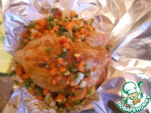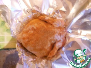 Закручиваем курицу в фольгу и в предварительно разогретую духовку отправляем ее жариться на час. -