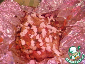 Нарезаем брынзу кубиками и добавляем к курице. Духовка к этому момента должна быть выключена. И не закрывая фольгой курицу даем постоять в духовке еще 5 минут.