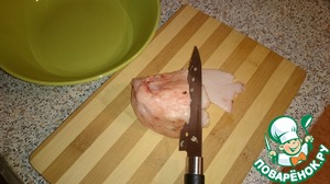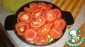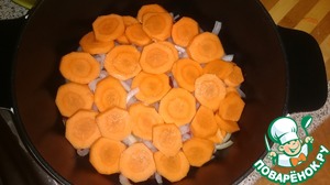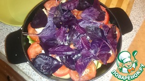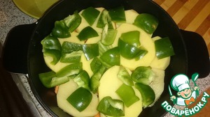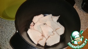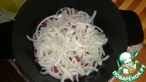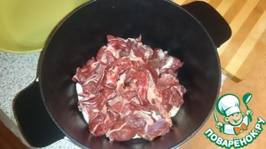 Сверху выкладываем мясо, нарезанное кусочками, солим.