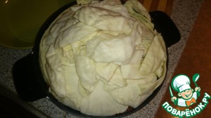 Последний слой- капуста. Далее закрываем казан, и ставим на самый медленный огонь, готовность блюда проверяем по капусте (если готова, то и блюдо готово). При подачи сверху посыпать зеленью.