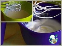 Взбиваем миксером несколько минут на высокой скорости до увеличения объёма и получения пышной светлой густой массы. Отложенные 2 белка, с маленькой щепоткой соли начинаем взбивать на небольшой скорости миксером ( не забываем предварительно вымыть венчики миксера) до устойчивой пышной массы, затем увеличиваем скорость, добавляем 1 ст. л. сахара и продолжаем взбивать до устойчивых пик.