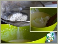 Предварительно просеянную муку -80 г ( Лука рекомендует просеять дважды) и взбитые 2 белка вводим в яично-желтковую смесь в три приема: треть муки еще раз просеять в смесь, аккуратно перемешать лопаткой, затем ввести третью часть взбитых белков. Вмешать их лопаткой сверху вниз. Затем опять часть муки.. часть белков. Перемешиваем и добавляем третью часть муки... и белков... Должно получиться нежное и воздушное тесто.