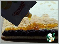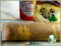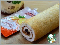 Разворачиваем бисквит. Сначала выкладываем сердцевину "бревнышка". На остальную часть наносим апельсиновый джем. Хоть конкурс и посвящен рецептам с майонезом, я не смогла обойтись без очень вкусного апельсинового джема "Махеевъ".