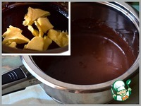 Пока рулет охлаждается, займемся " корой" для бревнышка. 70 мл молока смешать с 50г сахара, вскипятить. Добавить 20г какао-порошка, перемешать, снять с плиты. Добавить 3 грамма предварительно замоченного желатина. ( Я использую листовой, в пластинах). Тщательно перемешать до полного растворения желатина и дать остыть до комнатной температуры. В остывшую смесь добавить 70 г сливочного масла (тоже комнатной температуры), перемешать с помощью миксера.