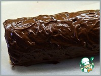 Нанести шоколадную глазурь на охлажденный рулет. Можно в два захода, с небольшим промежуточным охлаждением, чтобы слой "коры" получился толще. Оформляем либо ложкой...