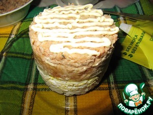 Пятый слой горбуша, выньте форму, сверху полейте красиво оставшимся майонезом