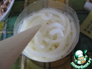 Майонез положите в кондитерский мешок, так легче будет смазывать слои и украшать салат, так же сделайте из пластиковой бутылки форму