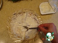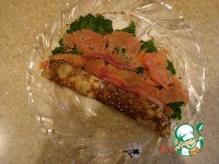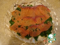 Далее раскладываем рыбу. Семгу лучше брать уже тонко нарезанную в вакуумной упаковке. Если пластики семги толще 3 мм, их нужно отбить, положив между поэлетиленовой пленкой.