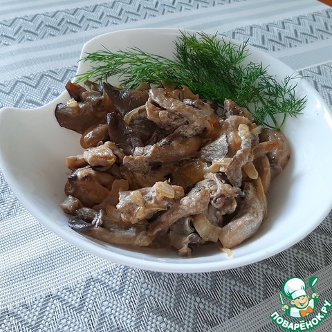Вешенки соединяем с обжаренным луком, добавляем соль, черный перец, сливки и тушим помешивая 5 мин.