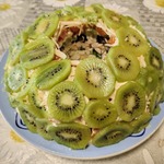 Украсить бока кусочками киви, сверху посыпать кубиками киви. Вынимаем стакан.