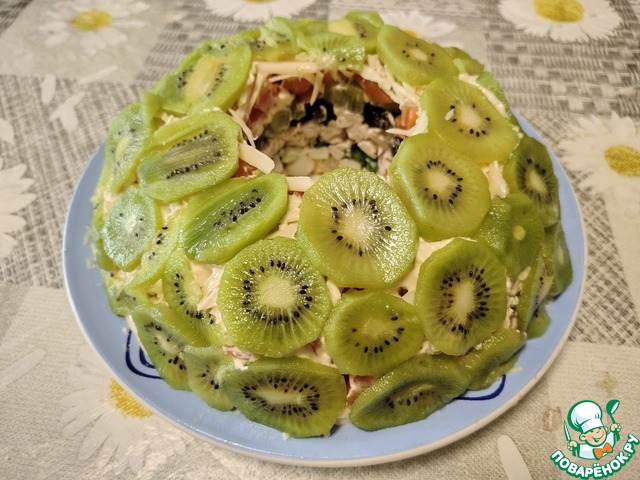 На середину блюда ставим стакан. Выкладываем слоями порезанные ингредиенты. Яйца, зеленый лук, куриное филе, чернослив, киви, морковь. Каждый слой смазываем майонезом.
