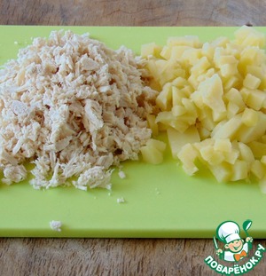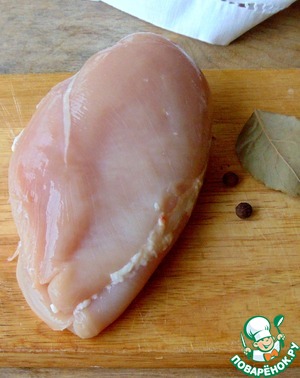 Куриную грудку отварить до готовности с лавровым листом и душистым горошком.