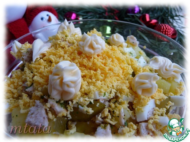 [+5]Рекомендую при приготовлении не мудрить с заправками и использовать просто майонез. Я готовила его уже три раза, и 2 из них в качестве заправки использовала обычный майонез, а 1 - приготовленный йогуртовый соус с чесноком. С ним вышло вкусно, но по-моему, этот соус не дал распробовать сам салат и сильно "оттягивал" вкус на себя.