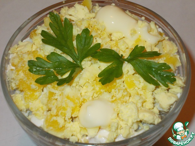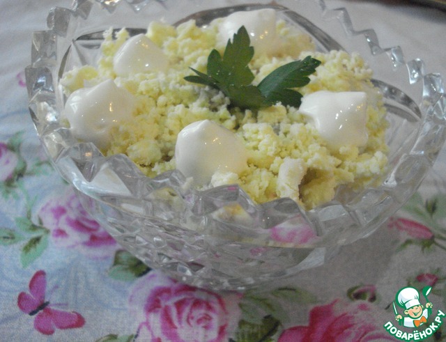 Сверху присыпать тертым желтком, украсить зеленью. -