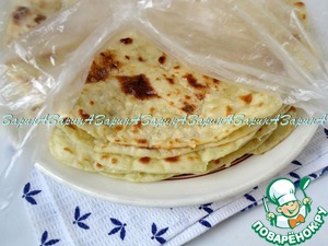 Готовые лепешки обильно смазывать сливочным маслом (смальцом) и укладывать друг на друга.